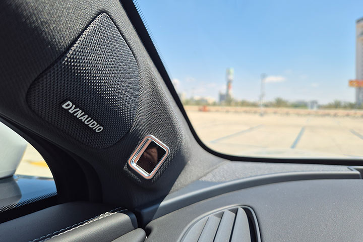מערכת השמע מצוינת מביתDynaudio עם 12 רמקולים – והשם שלה מפאר חלק מכיסויי הרמקולים – בעיקר על הקורות הקדמיות ועל הסאב שנמצא בדופן תא המטען.