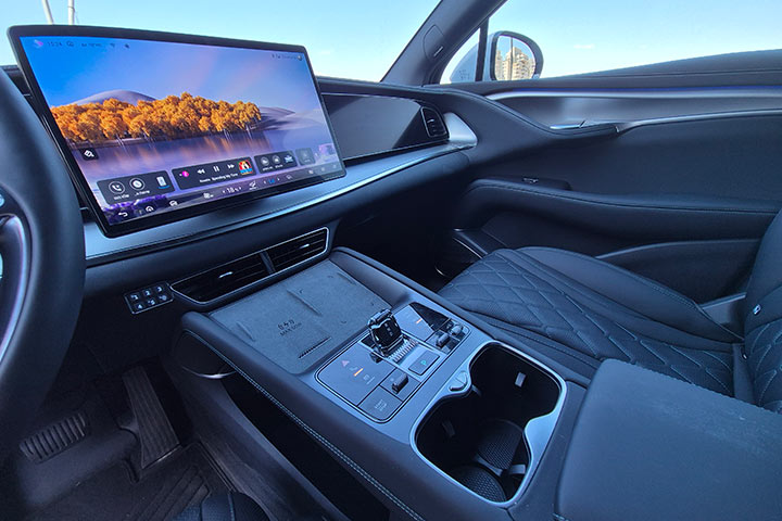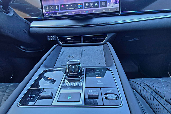 אגב המסכים, ניתן לקבוע להם רקע שחור או לבן, או מצב אוטומטי; ידית ההילוכים הזעירה מתפקדת היטב, והיא ממוקמת במקום נגיש ונוח. לידה יש 2 משטחים להנחת הטלפונים של הנהג והנוסע הקדמי, אחד מהם משמש לטעינה אלחוטית משמעותית (50w).