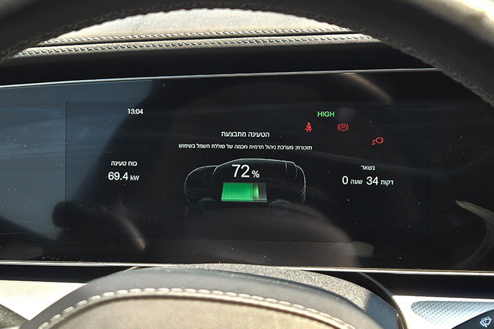 משך הטעינה המוצהר בין 10-80 אחוזים קורה ב- 24 דקות. בפועל, חיבור לתחנה של 250 קוו"ט, כשהרכב נטען לבדו בתחנה, העלתה טעינה מ- 29-80 אחוזים תוך 45 דקות. כשקצב הטעינה התעקש, משום מה, שלא להיות מהיר מ-80 קוו"ט, למרות שמדובר בטווח הפעולה האפקטיבי של הטעינה, שאמורה להיות מהירה.