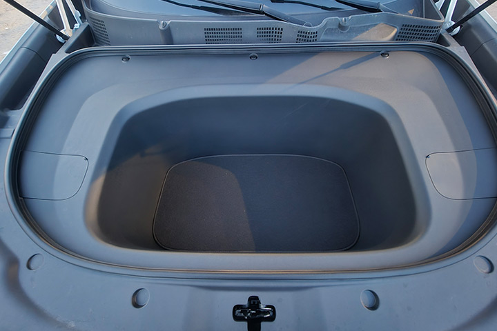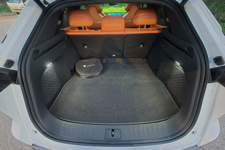 תא המטען האחורי רחב וגדול (435 ליטרים), רצפתו גבוהה יחסית, מתחתיה ערכת ניפוח לגלגלים. פתרון תא המטען הקדמי (Frunk) באמת מאפשר פה יכולת אחסון נוספת, עם נפח של 125 ליטרים.