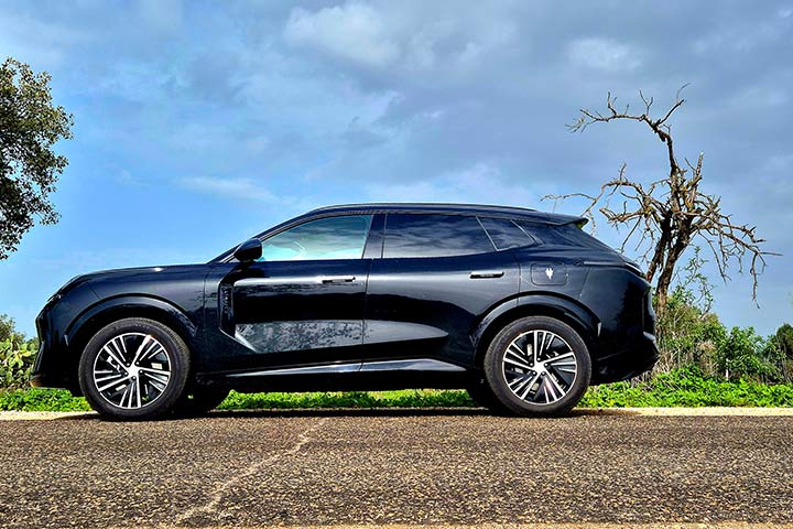 מהצד ידיות נשלפות לדלתות נטולות המסגרת, חישוקי 19" נאים, חלונות אחוריים כהים, מראות הצד- גם הן נטולות מסגרת- מותקנות על מעין עמודים צרים ומתחתן כיתובי לינק ביחידות אנכיות הממשיכות את מראות הצד – עוד אלמנט שחור שהולך לאיבוד עם הצביעה החיצונית שכאן, כך גם העיטור שבין קורות C ל-D – שבכל צבע אחר מקנה מראה של גג צף.