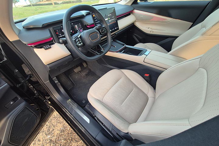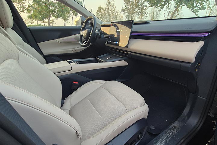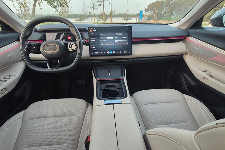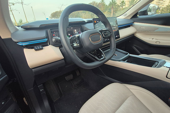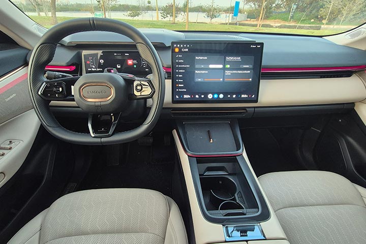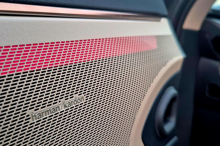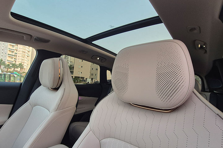 בפנים האווירה יוקרתית ומזמינה. החומרים שכאן מעולים, לא מעט עור נאפה וטבעוני פרוס כאן בכל מקום, החומרים גמישים ונעימים למגע ואיכות ההרכבה מצוינת. לכך מוסיפה תאורת אווירה מגוונת, עם טקסטורות מיוחדות גם על הדלתות, כך שהיא מתמזגת עם הפאנלים ששם, לרבות מתחת לכיסויי הרמקולים.
