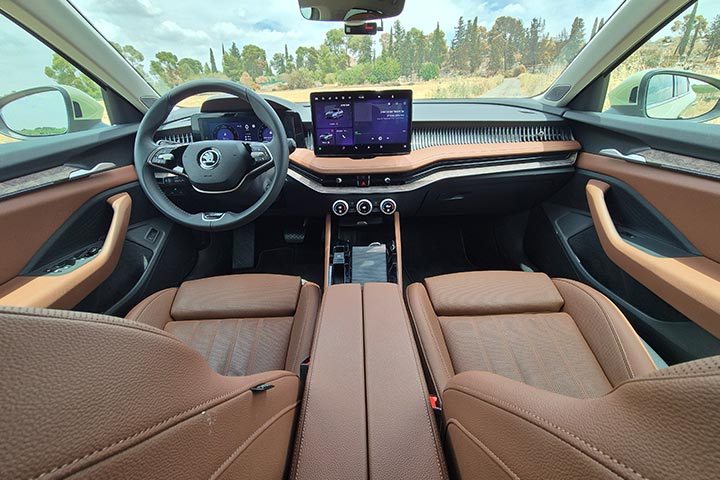תא הנוסעים בסופרב קיבל עדכונים רבים יותר מהחיצוניים, הן בטכנולוגיה והן בעיצוב; גם איכות החומרים מצוינת, ונראה ששופרה לעומת הדור הקודם. הרכב הנבחן מצויד בריפוד פנימי מעור בגוון קוניאק מחמיא.