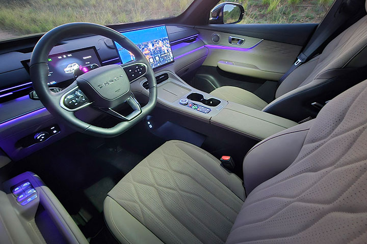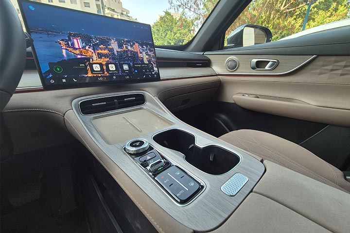 בפנים מראה מודרני המשלב צמצום ניכר בכפתורים, מסכים גדולים (15.6" למולטימדיה ו-10.25" למחוונים), וקונסולה מרכזית רחבה וגבוהה, עליה משטח טעינה אלחוטית 50w מאוורר, ומתחתיה תא אחסון גדול ושקעי טעינה. בהחלט מורגש שדרוג לעומת הדור היוצא.