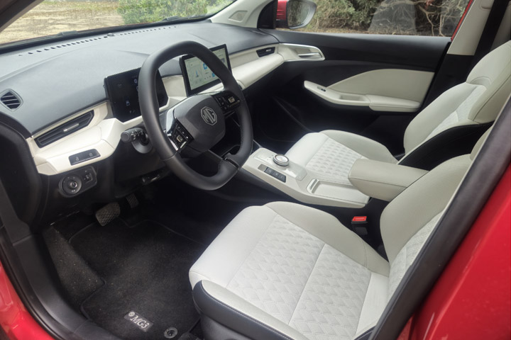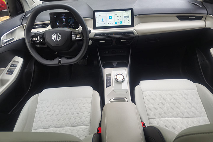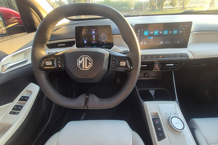 גם כאן לא חסכו ב-MG בתאי אחסון, ויש לא מעט מהם, כמו גם יציאות לטעינת הניידים וקישוריות לאנדרואיד אוטו ולאפל קארפליי. הגיר נשלט על ידי חוגה, סביבה משטח פלסטיק נאה המתכתב היטב עם הצבעים הבהירים סביב, בלם יד חשמלי עם אוטו הולד ובורר מצבי נהיגה מחסכוני, דרך רגיל ועד ספורט.